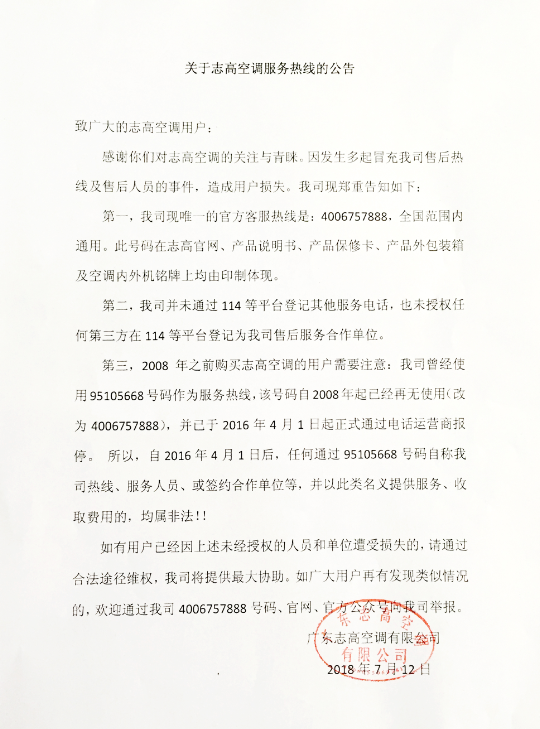 關(guān)于志高空調(diào)服務(wù)熱線的公告