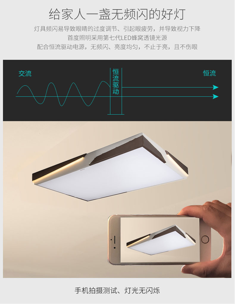 •光源使用加透镜方案,发光角度面积大,更均匀,自然护眼,灯体外置软灯条光源侧发光,带遥控控制。